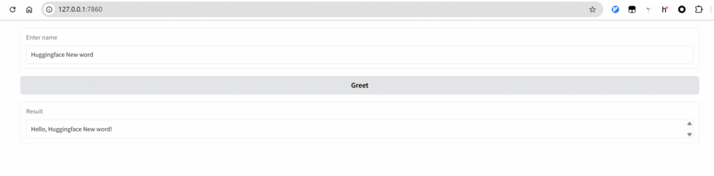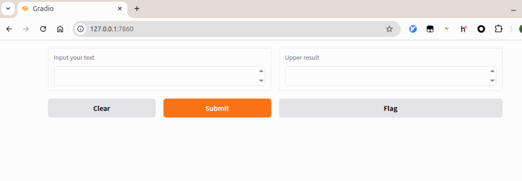 After running the code, the terminal will display a local access address (usually http://localhost:7860). Open it in a browser, and you’ll see an interface with an input box and an output box. Enter text and click “Submit” to see the uppercase result.