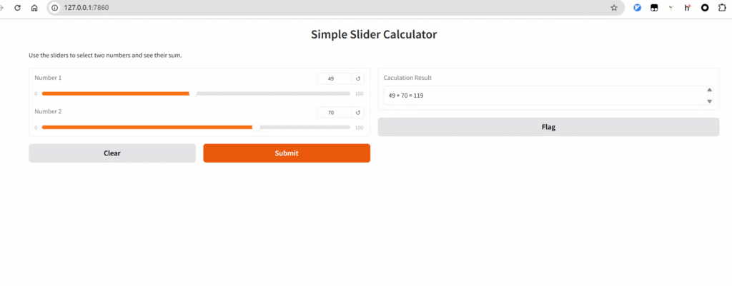 inputs=[gr.Slider(0, 100, label="Number 1"), gr.Slider(0, 100, label="Number 2")], # Two sliders