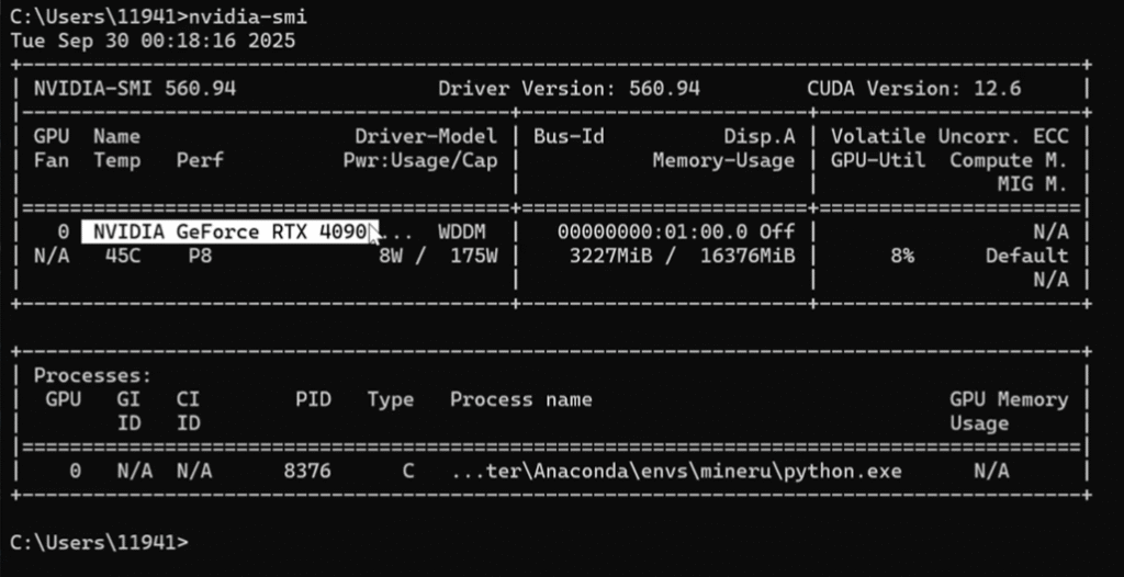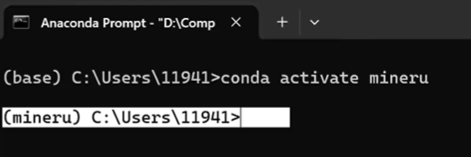 Once created, you’ll see (mineru) appear at the start of the command line, indicating the environment is activated successfully.