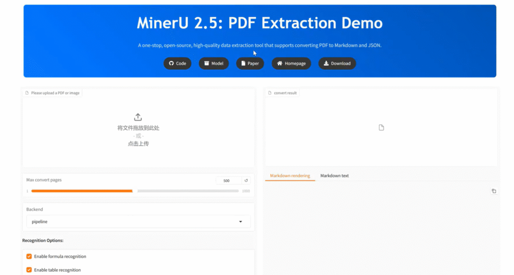 MinerU also offers a user-friendly web interface, which we can access via a browser:
