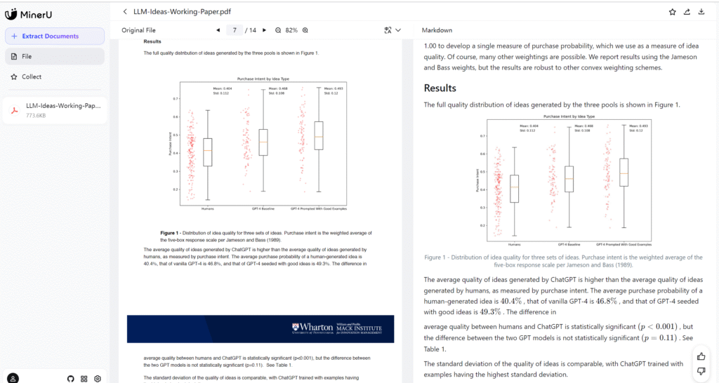 Click the upload button to upload PDF files—you can choose batch processing, select different models, and start parsing. The parsed results will appear on the right.