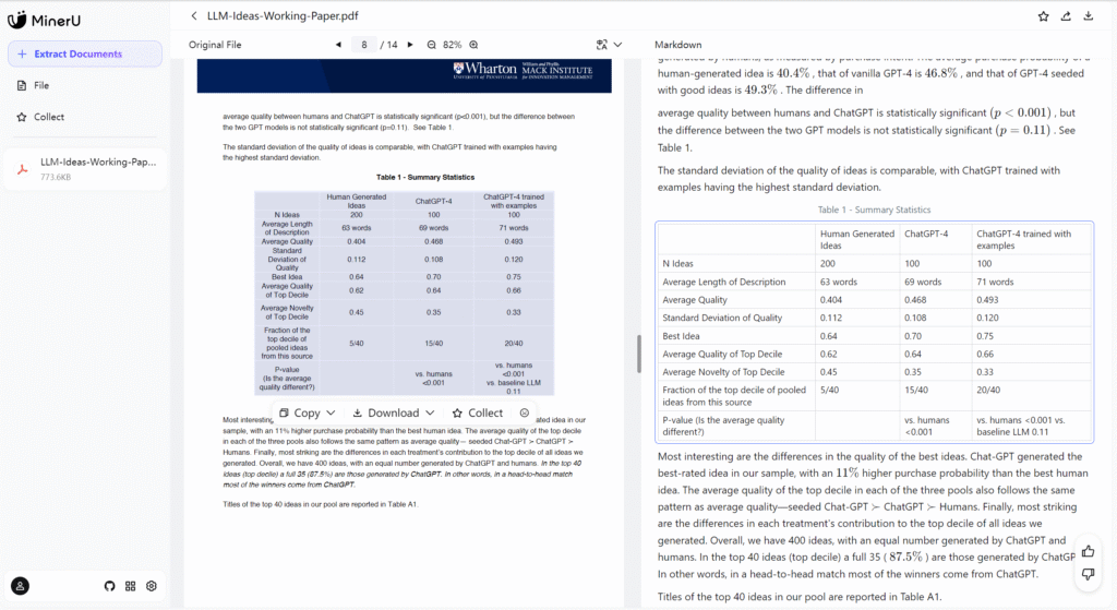 - Smoother User Experience MinerU emphasizes a “ready-to-use” experience—for example, automatically triggering OCR after screenshotting, real-time editing of recognition results, and one-click copying or insertion into notes, creating a more seamless workflow. Some users have noted that MonkeyOCR’s operation chain (like exporting and editing after recognition) feels a bit cumbersome by comparison.
