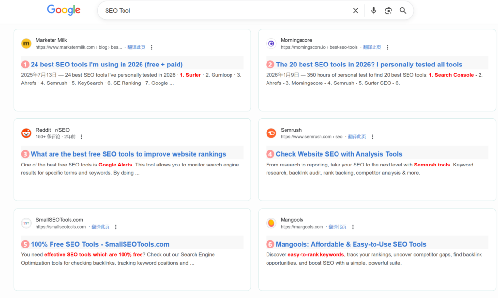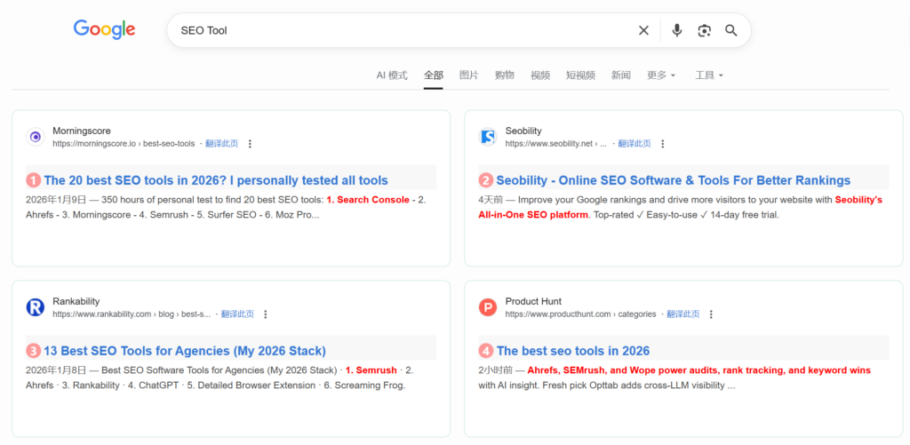 Example: Search results for the keyword “SEO Tool” on Google with and without account login:
